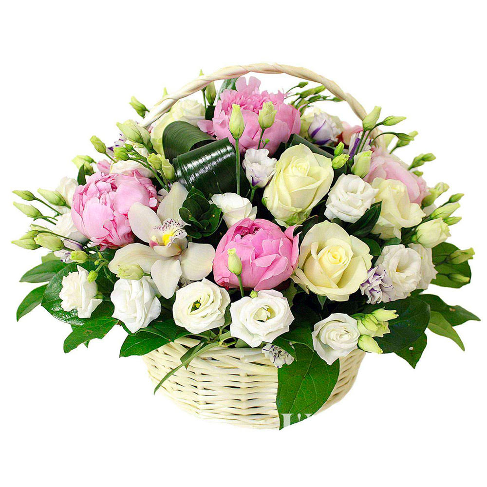 Пион, роза, эустома, орхидея, аспидистра.